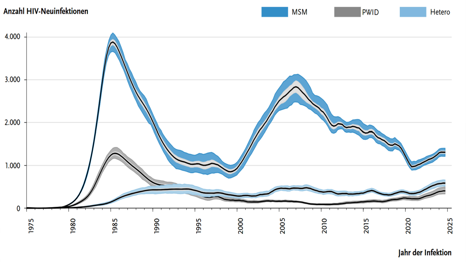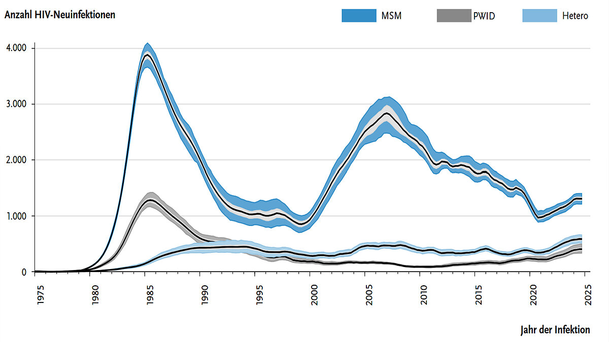 2024 wurden 2.300 HIV-Neuinfektionen registriert. Das sind 200 mehr als im Jahr 2023. Bei MSM (Männern, die Sex mit Männern) stieg die Zahl der Neuinfektionen von 1.200 im Jahr 2023 auf etwa 1.300 im Jahr 2024. Bei i.v. drogengebrauchenden Menschen gab es 2024 590 Neuinfektionen im Vergleich zu etwa 400 im Jahr 2023. In dieser Gruppe beobachtet man seit 2010 einen kontinuierlichen Anstieg. 32 Prozent aller neuen HIV-Diagnosen wurden 2024 erst mit einem fortgeschrittenen Immundefekt diagnostiziert; 18 Prozent der neuen HIV-Infektion wurde im Vollbild Aids diagnostiziert.